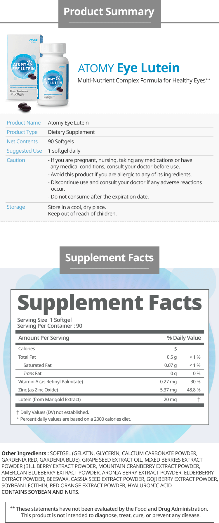 আই লুটেইন একটি বিশেষায়িত সাপ্লিমেন্ট, যা চোখের স্বাস্থ্য রক্ষার জন্য ডিজাইন করা হয়েছে। এই পণ্যটি চোখের ভালো দৃষ্টি এবং স্বাস্থ্য বজায় রাখার জন্য প্রয়োজনীয় পুষ্টি উপাদান সরবরাহ করার উপর মনোনিবেশ করে। এতে লুটেইন রয়েছে, যা চোখকে ক্ষতিকারক আলো এবং অক্সিডেটিভ স্ট্রেস থেকে রক্ষা করার জন্য পরিচিত। আই লুটেইনের প্যাকেজিং এবং উপস্থাপনা পেশাদারি এবং স্পষ্টভাবে এর উদ্দেশ্যকে চোখের স্বাস্থ্য সাপ্লিমেন্ট হিসেবে নির্দেশ করে। এই পণ্যটি অ্যাটমির উচ্চ-মানের স্বাস্থ্য সাপ্লিমেন্ট অফার করার প্রতিশ্রুতির অংশ।